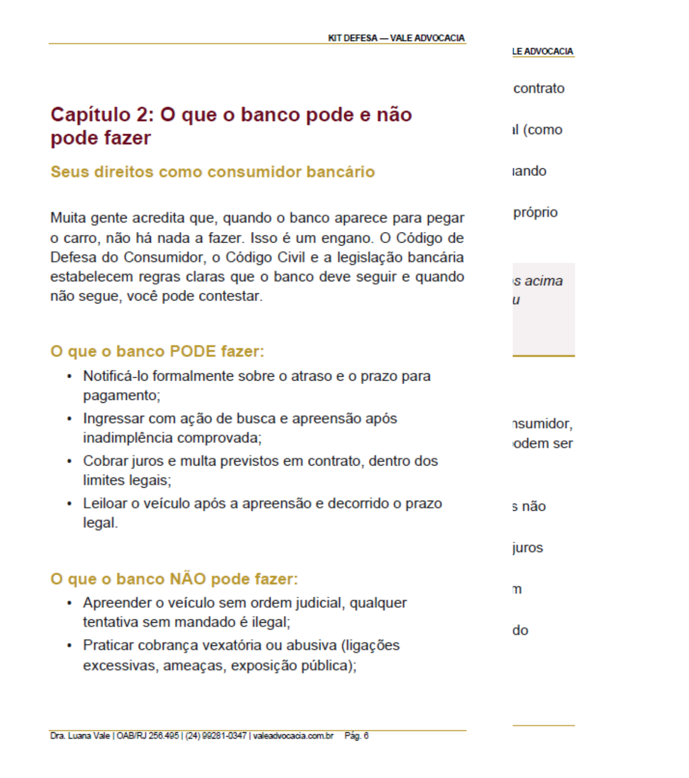 Sou advogada especializada em direito bancário, com foco em busca e apreensão de veículos e revisional de financiamento. Atendo consumidores que perderam ou estão prestes a perder seus veículos para bancos e financeiras. Escrevi este guia porque vejo pessoas todos os dias que não sabiam que tinham direitos, e perderam o carro sem precisar. Não deixe isso acontecer com você.